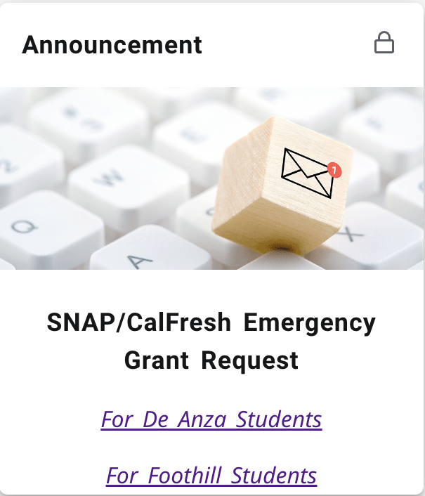At both De Anza College and Foothill College, we are committed to supporting your basic needs and well-being during this difficult time. To help offset the loss of SNAP/CalFresh benefits, we have created a process for students to request emergency funds through MyPortal.
