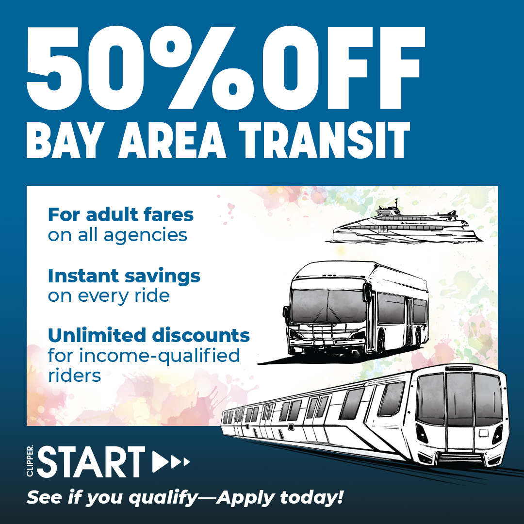 Clipper START is a pilot program to provide single-ride discounts to eligible low-income riders on AC Transit, BART, Caltrain, Golden Gate Ferry, San Francisco Muni, Santa Clara Valley Transit (VTA) and more.